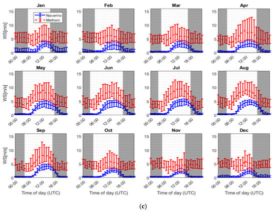 (a) The monthly frequency of local wind directions per hour at Methoni, November 2013 to December 2016. (b) The monthly frequency of local wind directions per hour at Navarino, April 2011 to October 2013. (c) Monthly median hourly local wind speed for Navarino, April 2011 to October 2013 and Methoni, November 2013 to December 2016, with the 15 to 85 percentile range indicated by the vertical bars. The grey parts show the period when sun is below horizon.