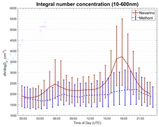 The diurnal variation of the total particle number concentrations at Navarino (observations for the period April 2011–September 2013) and at Methoni (observations for the period November 2013–December 2016). The lines indicate the median values while the error bars indicate the inter-quartile range.