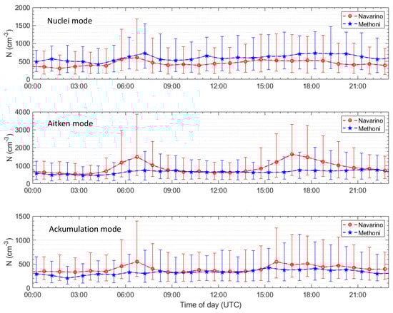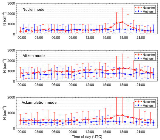 Diurnal variation of number concentration of nuclei, Aitken and accumulation modes for the warm period May–September (observations for the period April 2011–September 2013) and at Methoni (observations for the period November 2013–December 2016). The dotted curves indicate the median values while the error bars indicate the inter-quartile range.