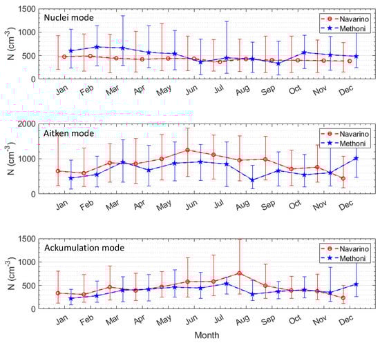 Monthly particle number in the different modes of all measurements between 9 and 15 UTC measured at Navarino and Methoni. The dotted curves indicate the median values while the error bars indicate the inter-quartile range.