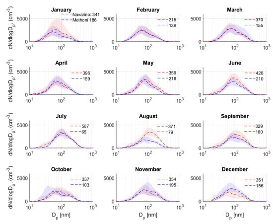 Monthly mean size distributions of measurements between 9 and 15 UTC at Navarino (in red) and Methoni (in blue). The numbers in each frame represents the total amount of hourly average size distributions used in the analysis.
