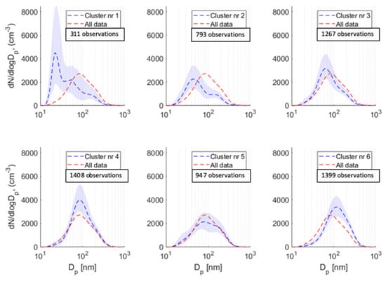 The use of clustering in the analysis of aerosol size distribution have found application in several studies focusing on the aerosol lifecycle and as well as in different process studies a wide range of environments [28,29,30,31]. Clustering of size distribution serves as an efficient way of identifying “signature” aerosol number size distributions. By linking the meteorological history and regional transport pattern of airmass trajectories to the different clusters, substantial amount of information can be extracted that allows for better understanding of the processes and sources at play in shaping the observations at the receptor.