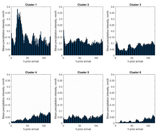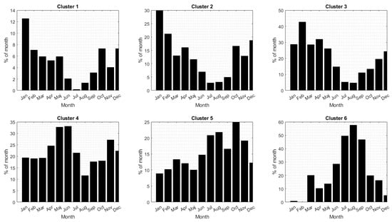 The seasonal distribution of cluster members is shown in Figure 13. It is evident that Cluster 1 is most frequently observed during the cold period and exhibits a minimum during summer months. The same seasonal pattern is present for Cluster 2 and Cluster 3. Cluster 4 is rather evenly distributed over the year, although slightly more frequently observed during May–June. Cluster 5 is most common during Autumn/early Winter, while Cluster 6 is typically observed during summer months.