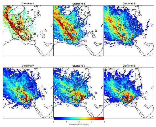 The transport probability, i.e., the probability an air mass trajectory has passed through a grid cell for cluster 1–6.