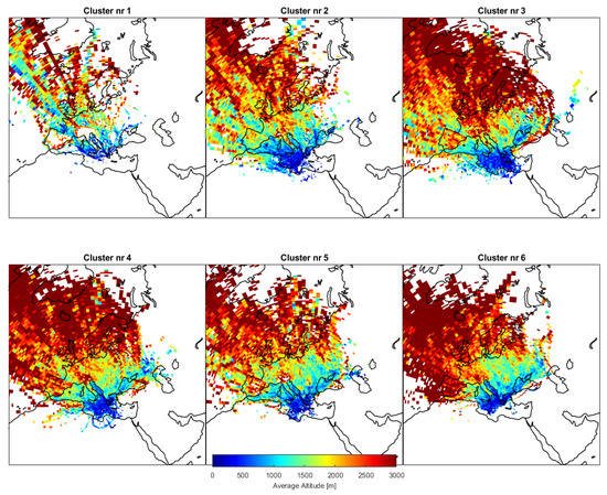 The trajectory data was subdivided into three different periods, resulting in one transport probability function for the warm period (May–September), one for the cold period (November–March) and one for the transition period (October and April). The result is displayed in the top panels of Figure 2. In addition to the transport probability function, the average altitude of each trajectory was mapped in a similar manner, providing the typical altitude the air parcel travels at over each grid. This aids the analysis of how the trajectories are transported in the vertical, and to what extent they are exposed to ground level emissions versus high level transport. The results are shown in the bottom panels in Figure 2.