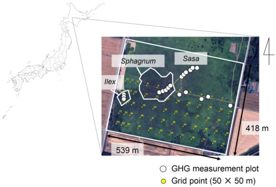 About 80% of Japan’s peatlands are distributed in the Hokkaido region (about 200,000 ha), a northern part of Japan with a cool climate. It is thought that almost all this peatland was originally a wetland, but most of it has disappeared by now due to agricultural development since 1870. The area of Ishikari Mire Complex, the largest in Hokkaido, which used to be spread out in the Ishikari River basin, has decreased to 0.2% in 1983 (119 ha) compared to 1870 (50,690 ha) [23]. Even in wetlands that have avoided disappearance due to agricultural development, changes in the wetland environment have occurred due to indirect effects of development. Typical examples are the influx of sediment into the wetland (floodplain mire) and following expansion of alder (Alnus japonica) forests due to human activities around the wetland [24,25], and the drying of the wetland and following invasion of Sasa (dwarf bamboo) [26,27,28]. These changes in the wetland environment may alter its GHG budget.