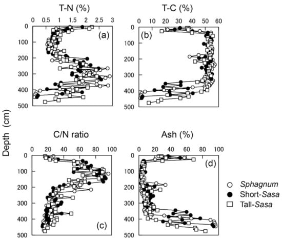 Peat C and N content (a,b), C/N ratio (c), and ash content (d) by depth in the Bibai wetland. The high ash content and low T-C content of the peat at a depth of 10–30 cm is due to the contamination of volcanic tephra.