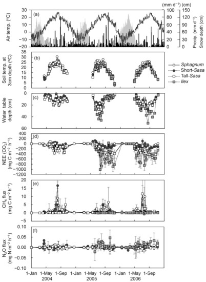 The net ecosystem exchange of CO2 in soil-plant ecosystems under natural vegetation has been reported to be −154 to −18.9 g C m−2 y−1 [37] and −105 to −53.0 g C m−2 y−1 [38] (i.e., uptake) in wetlands in western Finland. Heikkinen et al. (2002) [7] reported that NEE varied from −43 (uptake, intermediate fen) to 3 g C m−2 y−1 (emission, dry hummock) in the Russian tundra depending on the vegetation and water regime at the site. In the present study, the NEE in the Sphagnum site (−49.7 ± 40.2 g C m−2 y−1) was similar to those reported values, and the NEE in the tall-Sasa and Ilex sites (−240 ± 80 and −990 ± 91 g C m−2 y−1, respectively) were lower (i.e., higher CO2 uptake) than those reported values.