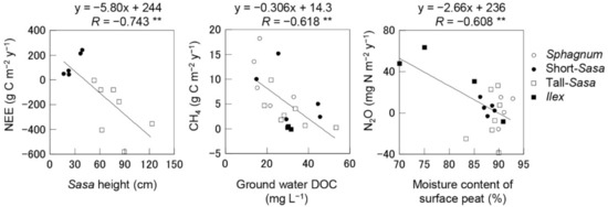 The averaged water table depth was positively and significantly correlated with PG, RTOT and N2O, and negatively correlated with NEE and CH4 (Table S3). Annual NEE in the Sasa sites (short- and tall-Sasa) showed a significant negative correlation (R = −0.743, p < 0.01) with Sasa height (Figure 4), indicating that net CO2 uptake increased as Sasa grew. The annual CH4 emission including all vegetation was significantly negatively correlated with groundwater DOC (R = −0.618, p < 0.01). The annual N2O emission was significantly negatively correlated with the moisture content of the surface peat (R = −0.608, p < 0.01).
