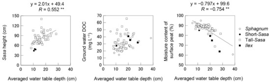 Relationships between averaged water table depth and Sasa height, ground water DOC or moisture content of surface peat at grid points. ** indicates significant at p < 0.01.