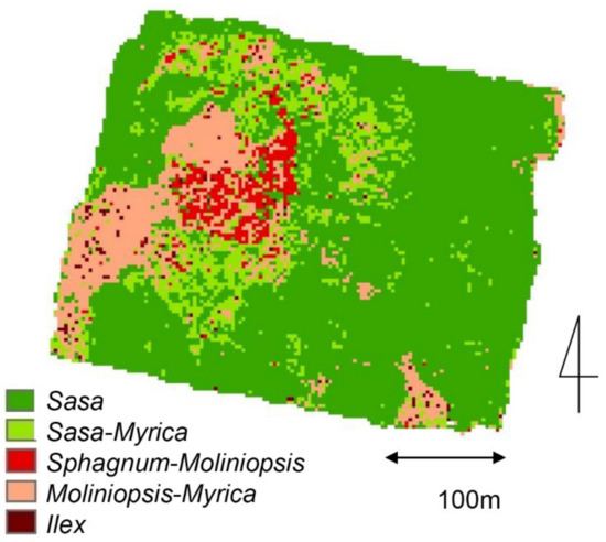The satellite band values at the grid points and flux measurement plots for each vegetation community are shown in Table S6. The band values (1–4) of the Sasa community tended to be higher than those of the other communities. Discriminant analysis using the vegetation communities at the study site (Sphagnum-Moliniopsis, Moliniopsis-Gale, Sasa, Sasa-Gale, Ilex) as the objective variable and IKONOS bands 1, 2, 3, 4, NDVI and RVI as explanatory variables showed that the discriminant contributors were bands 1, 2, and 4 (Table S7). Accuracy rate of vegetation classification by discriminant analysis was lowest in the Sasa-Gale community (66.7%), but was 100% in the Sphagnum-Moliniopsis and Moliniopsis-Gale communities. Overall, a 93.6% of accuracy rate was obtained. Figure 6 shows the distribution of vegetation in the entire wetland estimated by the discriminant analysis.