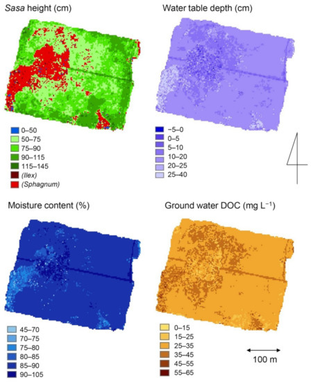 Multiple regression analysis was conducted by vegetation site using Sasa height, water table depth, moisture content of surface peat and groundwater DOC as objective variables and IKONOS band 1, 2, 3, 4, NDVI and RVI as explanatory variables and significant regression equations were established for each (Table S8). For Sasa height, all data were used for the analysis. For other environmental factors, 80% of all data were used to create regression equations, and the remaining 20% of data were used to verify the accuracy of the estimates (see below). Since multiple regressions could not be conducted for the Ilex site due to the small number of data, a single regression was conducted and those with high correlation coefficients were selected. Based on the above regression equation, Figure 7 shows the distributions of Sasa height in the Sasa sites and environmental factors in the entire wetland estimated from the satellite image bands.