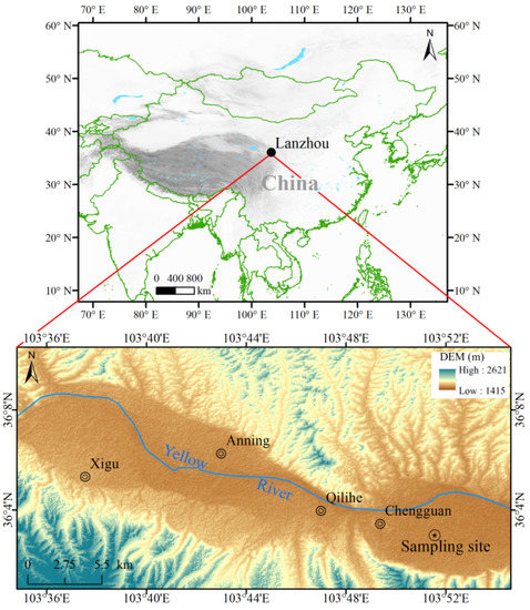 Lanzhou is surrounded by mountains and situated in a narrow river valley and that leads to its special meteorological conditions and inversion layer. The mean annual wind speed (WS) is only 0.8 m s−1 and the inversion weather accounts for about 80% of the days of the year [25]. Lanzhou is divided into four districts: Xigu, Anning, Qilihe, and Chengguan. Since the Chengguan district in Lanzhou is the center of government, residence, and commerce, several mixed pollution sources might be found. The sampling site was located in the Chengguan District of Lanzhou (Figure 1). The instrument was mounted on the roof of Scientific Research building NO.1 at the Northwest Institute of Eco-Environment and Resources (NIEER) (103.86° E, 36.05° N), and was about 20 m above the ground surface. At the same time, there are no visible high-rise buildings within 2 km around the sampling site. The sampling site is sheltered from dust and represents the typical atmospheric urban environment in Lanzhou.