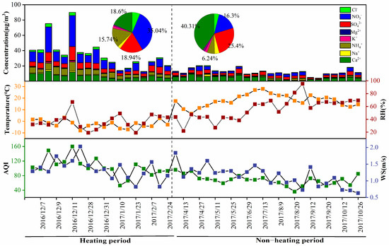 Meteorological conditions (e.g., WS and RH) have critical effects on the concentration of WSIs [42]. As shown in Figure 2, the WS ranged from 0.63 m/s to 1.84 m/s, with an average of 1.22 m/s. During the sampling period, the lower the WS, the higher the ion concentration, which suggested that high WS may be favorable for the diffusion of pollutants. For example, WS was increased from 1.6 m/s to 2.0 m/s on 11–27 December; the concentration of ions decreased from 89.99 to 37.54 μg/m3 conversely. On 6 April 2017, the concentration of WSIs reached 13.03 μg/m3, which was higher than the average (12.45 μg/m3) during the non-heating period, and it related to the maximum WS (1.84 m/s) and frequent sandstorms. RH plays a central role in the evolution and transformation of atmospheric aerosols, and the water content of aerosol mainly depends on RH and aerosol chemical composition. RH and the concentration of WSIs showed the same variation trends (Figure 2), which suggested that RH accelerated the chemical reaction and further increased secondary aerosols [43]. RH ranged from 19% to 95.29% (average of 47.8%). On 11 December 2016, RH and ions concentration both reached the highest values, which were 66.88% and 89.99 μg/m3, respectively. On 23 January 2017, the RH reached the lowest value (19%), the concentration of ions was at a low value (25.57 μg/m3). Above all, the influence of WS and RH on ion concentration should not be underestimated.