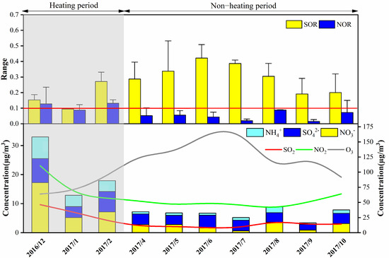 SO42− and NO3− are usually the most crucial ions in atmospheric aerosols; NOX and SO2 are precursor gases that form sulfates and nitrates. SOR and NOR are investigated to quantify the degree of conversion of SO2 to SO42− and NOX to NO3−. Studies have shown that the critical values of SOR and NOR are both 0.1, and higher SOR and NOR values indicate higher secondary conversion efficiency [29]. As shown in Figure 3, SOR and NOR were 0.23 and 0.08 during the sampling period, SOR was higher than NOR, indicating the higher secondary transformation of SO2 compared to NO2. The SO42− concentration (4.79 ± 3.02 μg/m3) was lower than NO3− (6.60 ± 8.06 μg/m3) and SO2 (23.79 ± 17.5 μg/m3) was lower than NO2 (65.61 ± 29.63 μg/m3). This might be due to the effective control of SO2 emissions since the Chinese government implemented relevant measures, such as adjustment of industrial and energy structure, clean production, industrial desulfurization, green development et al. [44,45].
