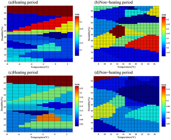 Relationship between SOR (a,b), NOR (c,d) and temperature and humidity (RH), respectively.