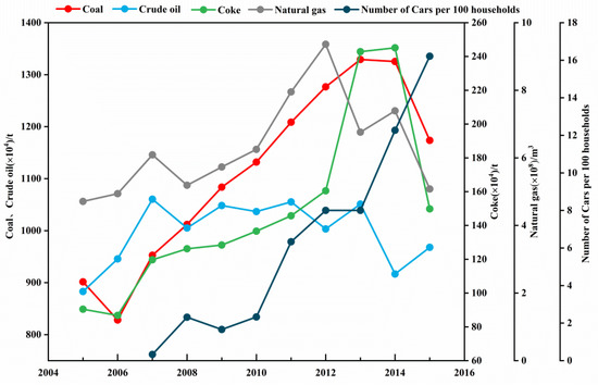 The energy consumption of industrial enterprises and the car ownership of urban residents in Lanzhou in recent years.