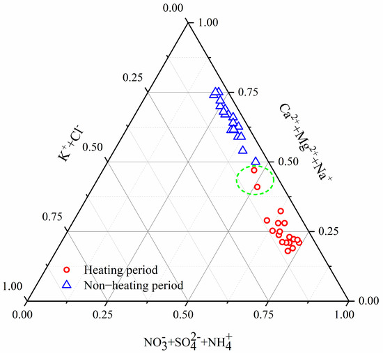 Phase diagram of the ternary system: anthropogenic source ions: [NO3− + SO42− + NH4+], natural source ions: [Mg2+ + Na+ + Ca2+] and biomass source ions: [K+ + Cl−]. The green circle represents two special days (11 December 2016 and 31 January 2017) during the heating periods and the value tends to move to the low value area of the anthropogenic source ions and the high value area of the natural source ions.