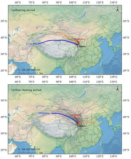 To determine the potential long-distance transport pathways of air mass reaching Lanzhou, 72 h backward air-mass trajectories were calculated using the Hybrid Single-Particle Lagrangian Integrated Trajectory (HYSPLIT) model and the National Centre for Environmental Prediction (NCEP/NCAR) Global Data Assimilation System (GDAS) dataset (ftp://arlft.Arlh.Noaa.gov/pub/Archieve accessed on 31 March 2021). We obtained a total of 365 daily trajectories averaged from 6-h interval trajectories (including 00:00, 06:00, 12:00 and 18:00), which can be grouped into three clusters via the built-in clustering tool in the model. We also calculated the median trajectory for each cluster. More details of the cluster analysis are available in Draxler et al. [31].