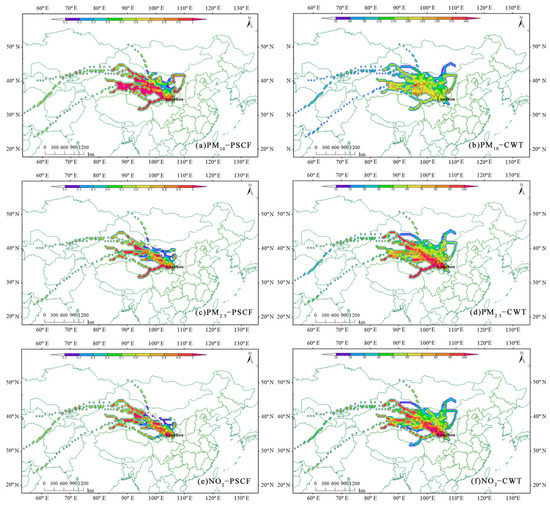 Potential source contribution function (PSCF) of particulate matter (PM)10 (a), PM2.5 (c) and NO2 (e) and concentration-weighted trajectory (CWT) of PM10 (b), PM2.5 (d) and NO2 (f) in the heating period in Lanzhou.