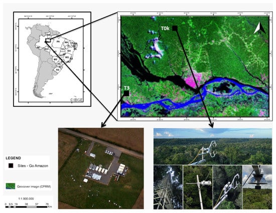 The data used in this work were collected at the Cuieiras (S–W) and Manacapurú (S–W) sites, hereafter designated T0k and T3, respectively (Figure 1). The site T3 is approximately 70 km from the city of Manaus, State of Amazonas, Brazil, in a grassland region of 2.5 by 2 km, surrounded by old-growth forest []. The data were obtained as part of the US Atmospheric Radiation Measurement (ARM, https://www.arm.gov/, accessed on 1 March 2021) program, during the GoAmazon (Observing and Modeling of the Green Ocean Amazon) experiment [].