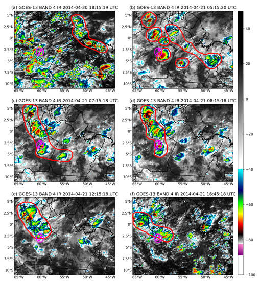 Satellite imagery data are used to identify and monitor the propagation of SLs. The GOES-13 (Geostationary Operational Environmental Satellites) channel 4 enhanced infrared images were obtained from the website of the Comprehensive Larga Array-data Stewardship System of National Oceanic and Atmospheric Administration (CLASS-NOAA, http://www.avl.class.noaa.gov, accessed on 1 March 2021). The satellite images used to identify convective clouds and SL are in the infrared band often referred to as cloud top temperature and have been employed in numerous studies of deep atmospheric convection [,,].