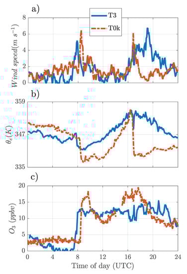 Time series of: (a) Horizontal wind speed, (b) equivalent potential temperature (), and (c) ozone () measured on 21 April 2014, above the Manacapuru-T3 experimental site (blue line) and T0k (dashed red line), during the displacement of squall lines above the analyzed sites.