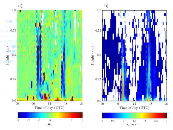Temporal variation of the vertical profiles of: (a) skewness () and (b) standard deviation () of the vertical wind velocity, during 21 April 2014 measured above the T3 site. The gray dashed lines indicate the time of occurrence of the downdrafts coming from the squall line.