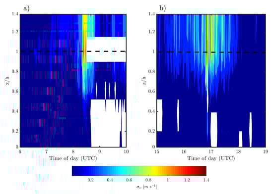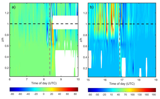 Figure 4a,b show the temporal variation of the vertical profiles of and respectively, measured above the T3 site. These profiles extend to 1 km above the measurement level with a vertical resolution of 30 m. It is possible to observe that around 0740 and 1640 UTC (these times are delimited by gray dashed lines) and were close to and , respectively. These values indicate the presence of strong downdrafts and intense turbulence at the same times that the two branches of SL2 are located exactly above the T3 site.