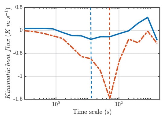 Figure 7 shows the multiresolution w’T’-cospectra for the period of 3 h before the arrival of branch 1 (blue line) and during the passage of branch 1 (red dashed line) at site T0k. The cospectra were calculated using data points, which is equivalent to approximately 28 min of data recorded at 20 Hz.