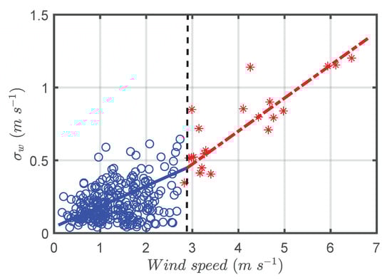Standard deviation of the vertical wind speed () as a function of the mean horizontal wind speed (U). Each point corresponds to averages of 5 min of data. The blue circles and red asterisks correspond to periods of absence and presence of SL2, respectively. The black dashed line indicates the threshold below, where only points belonging to the absence period of SL2 (weak turbulent regime) are found and above that threshold corresponds to periods of the presence of SL2 (strong turbulent regime). The red dashed and blue lines correspond to least squares fits.