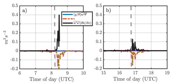 The data from our case study (April 20) were visually inspected to eliminate faulty data before estimating turbulent parameters. In addition, spike detection and elimination was applied in the fast response data to correct common faults in the time series of turbulent variables []. The time interval used to estimate the turbulent statistical moments was 5 min for the night-time period [] and 30 min for the daytime period [].
