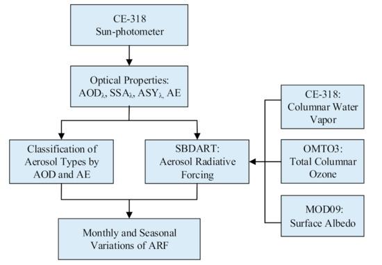 To investigate the optical properties and radiation characteristics of aerosols in Harbin, Heilongjiang Province in 2017, the team collected aerosol optical parameters such as aerosol optical depth (AODλ), single scattering albedo (SSAλ) and asymmetry factor (ASYλ) at five wavelengths (ie 440, 500, 675, 870 and 1020 nm) and Angstrom exponent (AE). For the calculation of ARF, parameters such as columnar water vapor, daily average visibility, total columnar ozone, and surface albedo are needed in addition to the aerosol optical parameters. Both the columnar water vapor and aerosol optical parameters were obtained via a CE-318 sun-photometer, while the total columnar ozone and surface albedo were both obtained from satellite remote sensing. The research framework is outlined in Figure 1.