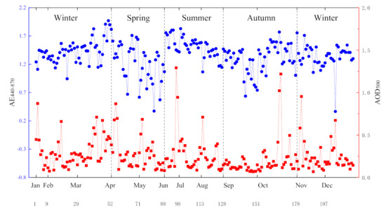 Seasonal variations in aerosol optical depth at 500 nm and Angstrom exponents at 440–870 nm during the study period.