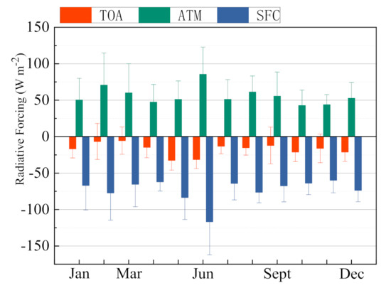 ARF at TOA, SFC, and within the ATM are calculated using the SBDART model to analyze the overall level of and monthly variations in ARF, as shown in Figure 3. In addition, we compared ARF in the present study with that in some previous studies in different regions of China, as shown in Table 3. Figure 3 shows that the ARF at the TOA ranges from (March) to (May) with an annual mean value of . ARF at the SFC varies between (November) to (June) with an average annual value of . The calculated values of ARF within the ATM are between (October) and (June), with an annual mean value of .
