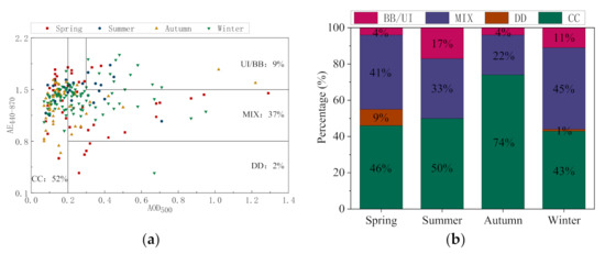 The scatter plot of the daily mean and as well as the total percentage of various aerosol types during the year are shown in Figure 4a; the percentage of various aerosol types during different seasons is calculated in Figure 4b. As shown in Figure 4a, the total percentage of various aerosol types during the year is 52% for CC aerosols, 37% for MIX aerosols, 9% for BB/UI aerosols, and 2% for DD aerosols. Figure 4b shows that CC, MIX, BB/UI, and DD aerosols are respectively 46%, 41%, 4%, and 9% in spring, 50%, 33%, 17%, and 0% in summer, 74%, 22%, 4%, and 0% in autumn, and 43%, 45%, 11%, and 1% in winter. It can be seen that there are obvious differences in the aerosol types between different seasons. During the study period, the dominant aerosol type in Harbin is CC, indicating that aerosol loading is light overall. CC aerosols account for the highest proportion in autumn, corresponding to the lowest aerosol loading, which is due to the active atmosphere in Harbin [12]. MIX aerosols have a wide range of sources and are found to be the second-largest contributor during the study period. What is more, MIX aerosols account for more than 20% of the aerosol types in all seasons, which shows the important influence of MIX aerosols in Harbin throughout the year. There is a higher proportion of MIX aerosols in both spring and winter. In spring, this is due to the rise in temperature and the large increase in dust particles, while, in winter, it is related to the increase in soot and dust particles caused by activities such as heating and biomass burning [47]. The proportion of BB/UI aerosols is lower during the study period, but it varies greatly in different seasons. The contribution of DD aerosols is the lowest (2%) during the year, and it occurs mainly in spring, which suggests that sand pollution is most likely to occur in the spring in the study area.