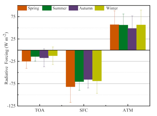 In Section 3.2, we analyzed the monthly variations in ARF and found visible differences in ARF between different months during the year. Therefore, it is necessary to further study the seasonal variations in ARF. The mean values of ARF at the TOA, SFC, and within the ATM in different seasons are shown in Figure 5. As shown in Figure 5, the ARF at the TOA, SFC, and within the ATM are respectively , , and , during the spring, , , and during the summer, , , and during the autumn, and , , and during the winter.