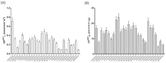 Oxidative potential expressed as OPDTTV (A) and OPDTTM (B) measured in aqueous extracts of the PM10 samples.