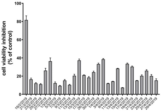 As regards the cytotoxicity data obtained by the MTT test on A549 cells (Figure 2), in all the samples analyzed, statistically significant inhibition of the NAD(P)H-dependent cellular oxidoreductase enzymes was observed following the exposure of the cells for 24 h to the aqueous extracts of PM10 compared to control cells. The dose-dependence of the response of the assay for the aqueous extracts was preliminarily assessed exposing A549 cells to different dilutions of the same extract, as reported in previous work [16]. The sample obtained on 19th February, which expressed the highest OPDTTV value, was able to induce cellular viability inhibition of about 80%. All the other samples showed values on average below 50% cell viability inhibition. Fourteen samples were in the range between 20% and 50% ascribable to slight cytotoxicity, while the remaining twelve samples did not exceed the 20% viability inhibition value.