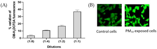 (A) Cell-mediated oxidant generating capacity of PM10 (expressed as percentage variation of fluorescence intensity vs. negative control) in A549 cells exposed for 24 h to increasing dilutions of the aqueous extract obtained from PM10 collected on 20/3/2019; (B) Representative confocal images of control and PM10 exposed (24 h) A549 cells charged with the probe CM-H2DCFDA.