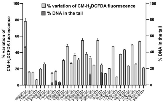 The results expressed as % of DNA in the comet tail are shown in Figure 4 by dark bars. The genotoxicity data showed very good correlations (Pearson r > 0.95) with the intracellular oxidative stress and with the cell mortality observed with the MTT test. The maximum value of % of DNA in the tail was observed for the sample of 19 February 2020. However, the number of data for genotoxicity is quite limited and this result should be confirmed with further studies.