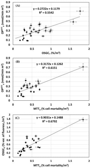 To investigate if there is any relationship between the outcomes of the cellular and acellular assays on the same samples, a comparison of the results obtained with the different tests was performed (Figure 5). The analysis was focused on data normalized in volume, which is a metric relevant for human exposure. The intracellular oxidative stress induced by PM is statistically correlated (Figure 5A) to the acellular oxidative potential, suggesting that the ability of PM10 to generate intracellularly reactive species is, in a certain way, related to its oxidative potential. Moreover, the oxidative potential is related to cytotoxicity (Figure 5B), which is a cellular endpoint with integrates all the potentially toxic effects that PM10 can exert in the cell. Cytotoxicity is related to the PM oxidative stress-inducing capacity (Figure 5C), suggesting that intracellular oxidative stress plays a key role in the multiple mechanisms underlying PM10 cytotoxicity. Figure 5 includes the sample of 19 February 2019 that seems to lead most of the correlation, however, if this sample is eliminated the correlations still remain statistically significant, even if weaker.