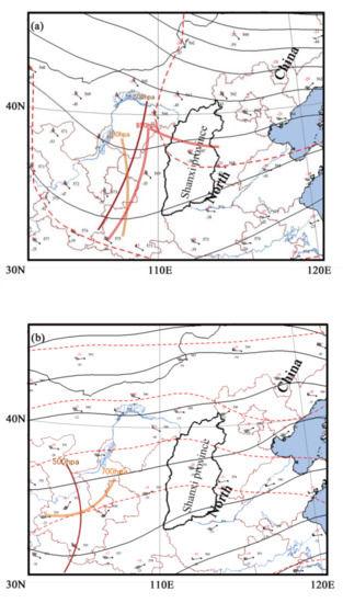 Synoptic conditions over North China: (a) 29 November 2011 at 08:00 LST and (b) 3 March 2012 for 08:00 LST.