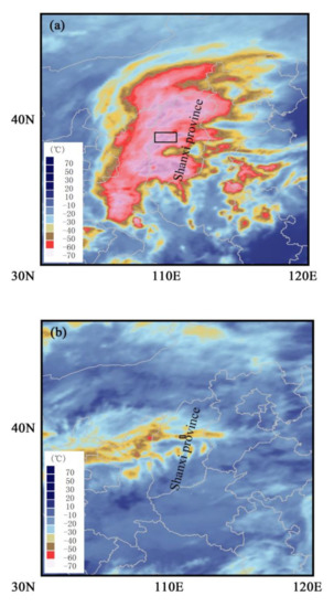 The FY-2C infrared cloud image at 08:30 on 29 November shows that Shanxi Province was covered with large and dense cloud clusters with a deep cloud system. The cloud top brightness temperature was low, indicating that the cloud top height was high (Figure 2a). At 10:30 on 3 March, the central part of Shanxi Province was covered by a southwest northeast zonal cloud system. The infrared cloud image was yellow, and the cloud top height was lower than that on 29 November. According to the visible light cloud map, medium and low clouds were dominant. The cloud was scattered and the cloud thickness was uneven. (Figure 2b).