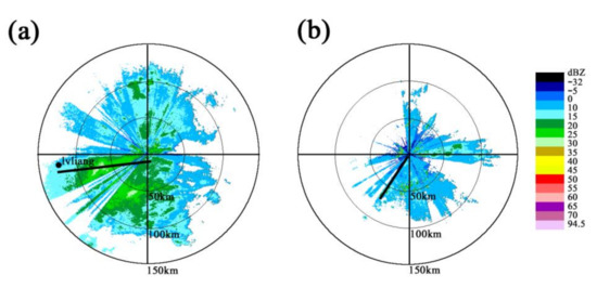 Plan position indicator (PPI) radar scan of reflectivity (dBZ) from C band Doppler weather radar located in Taiyuan City (in the middle of Shanxi Province): (a) 29 November 2011 for 09:02 LST and (b) 3 March 2012 for 10:12 LST (thick black solid line for the flight track).