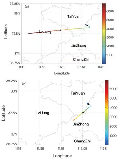 On 29 November (Figure 4a) at 08:37, the plane took off from Taiyuan, which is located in the middle of Shanxi Province. There was light snow when the plane took off and climbed. At 10:21, it reached Lvliang, which is located in western Shanxi Province, and then climbed to 6395 m (T = −19.5 °C), but it did not reach the cloud top. On 3 March (Figure 4b), the plane took off from Taiyuan at 09:53. There was light snow when taking off and as it kept climbing after taking off. At 10:14, it reached Jinzhong near Taiyuan at an altitude of 4523 m (T = −12.6 °C), and the cloud top height was 4200 m.