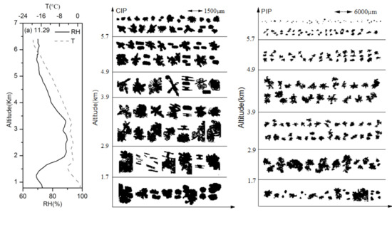The shape of ice crystals depends on the temperature inside the cloud [7,29]. Figure 5a shows that the temperature range of the flight on 29 November is approximately −19.5 to 1 °C and the relative humidity range is approximately 69% to 90%. The observed particle imageries mainly include needle columnar, dendritic, plate-shaped, capped-column and irregular types. Above 5.7 km (−16 °C), types are dominated by irregular single particles. From 5.7 km to 4.9 km (−16 to −11 °C), irregular and columnar particles are dominant and dendritic particles appear. Columnar ice crystals are observed in relatively high ice clouds [30]. From 4.9 km to 2.9 km (−11 to −3 °C), the number of dendritic particles begins to increase and aggregation begins to dominate. A number of riming particles also appears. In addition, there are capped-column, columnar and irregular particles. The relative humidity in the clouds below 2.9 km (−3 to 1 °C) is approximately 89%, which is dominated by aggregation, and the riming particles continue to increase. A large number of needles and a small amount of capped-column particles appear at 2.9−1.7 km (−3 to −2 °C). Because the ground temperature is slightly higher than 0 °C, the ice and snow crystals near the ground (below 1.7 km) partially melt. Korolev et al. [31] found that the distribution of particle imagery observed in natural clouds does not conform to the Magono‒Lee map and the distribution of ice crystal imagery with temperature in this snowfall does not completely conform to the Magono‒Lee map [7]. Laboratory studies have proven that dendritic ice and snow crystals should be formed in the −15 to −10 °C layer. In this process, a large number of dendritic ice and snow crystals appear at −10 to −2 °C, which indicates that these particles should fall down from a higher level. The capped-column ice crystals appeared at −11 to −2 °C on 29 November. Previous studies showed that capped-column ice crystals cannot be formed in this temperature range [32] and that the capped-column ice crystals in this layer may be formed from higher clouds (−18 to −25 °C); moreover, columnar ice crystals falling through clouds (−13 to −18 °C) are suitable for the formation of plate ice crystals, and plate ice crystals are formed at both ends of columnar ice crystals.