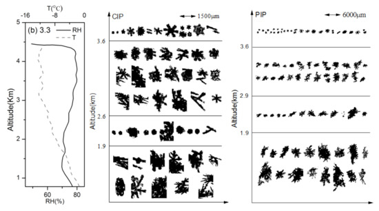 The temperature range of the flight on 3 March 2012 was approximately −12.6 to −1.4 °C, and the relative humidity range was approximately 49% to 80%. The observed particle imageries mainly include needle, dendritic, plate-shaped and irregular. The morphology of ice and snow crystals observed above 3.6 km (−12 °C) is mainly dendritic and plate-shaped, with a small amount of needle ice and snow crystals. There are a large number of dendritic and aggregating ice and snow crystals and a small amount of plate-shaped ice and snow crystals observed at 3.6–2.6 km (−12 to −10 °C). The morphology of ice and snow crystals observed at 2.6−1.9 km (−10 to −7 °C) is mainly plate-shaped, with a small amount of dendritic ice and snow crystals. From 1.9 km to the ground (−7 to −1.4 °C), the results show that the morphology of ice and snow crystals is mainly dendrites and aggregates.