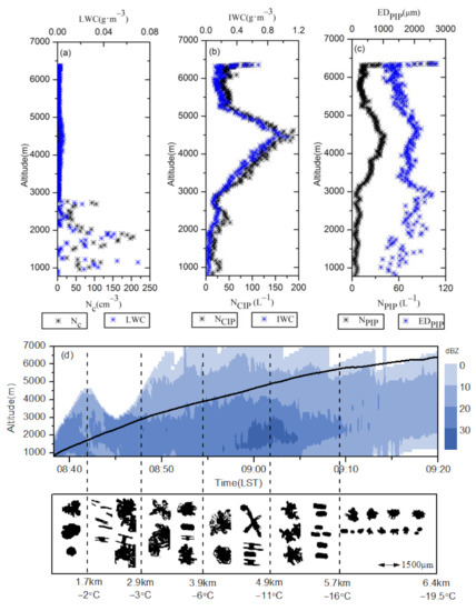 - Zhu, S.; Guo, X.; Lu, G.; Guo, L. Ice Crystal Habits and Growth Processes in Stratiform Clouds with Embedded Convection Examined through Aircraft Observation in Northern China. J. Atmos. Sci. 2015, 72, 2011–2032. [Google Scholar] [CrossRef]