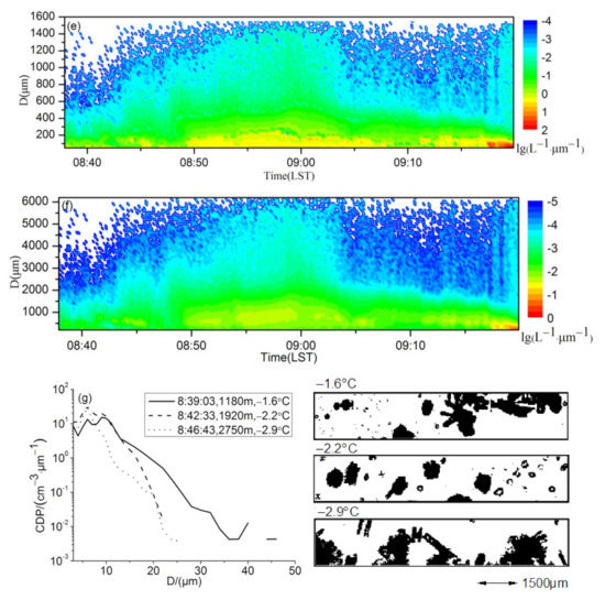 The echo intensity of 2.6 to 1.9 km (−10 to −7 °C) is less than 20 dBZ, and the echo top height is 3 km (−10.5 °C). A large number of plate-shaped ice and snow crystals (09:58 to 10:12, see Figure 7e) with diameters less than 600 μm and a small number of large dendritic snowflakes and aggregates are observed. The concentration of ice crystals detected by the CIP varies from 13 to 76 L−1, and the maximum concentration of particles detected by the PIP is 9 L−1, which may be due to entering another cloud.